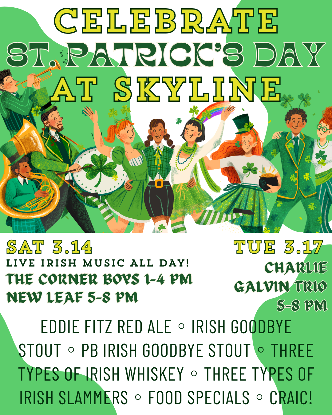 Spend the day at Skyline with Irish beer, celebratory food and cocktail specials, and incredible live Irish music!